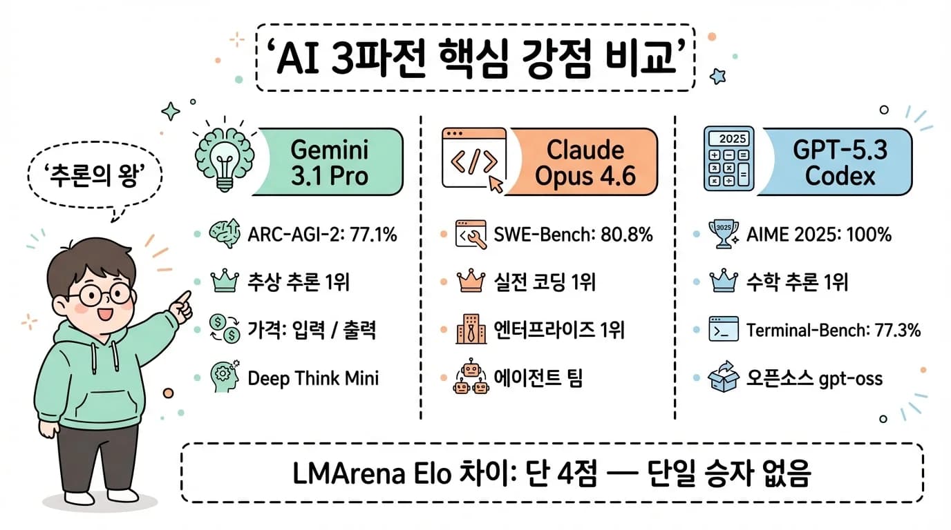 2월 5일 오후, Anthropic이 Claude Opus 4.6을 공개했습니다. 정확히 20분 뒤, OpenAI가 GPT-5.3-Codex를 내놓았습니다. 그리고 2주 후인 2월 19일, Google DeepMind가 Gemini 3.1 Pro를 발표했습니다. 3주 만에 세 회사가 각자의 최신 플래그십...