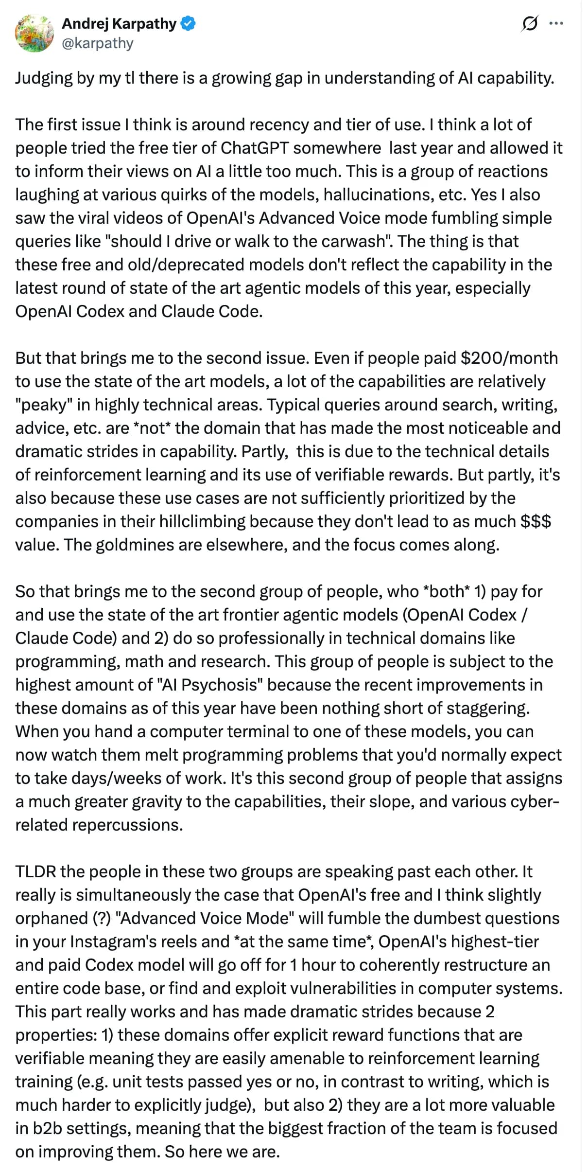 내 타임라인을 보면 AI 능력에 대한 이해 격차가 점점 벌어지고 있다. 첫 번째 문제는 사용 시점과 요금제 수준이다. 많은 사람이 작년쯤 ChatGPT 무료 버전을 써보고, 그 경험이 AI에 대한 인식을 과도하게 지배하도록 내버려뒀다. 이 부류는 모델의 여러 허점이나 환각 현상을 보고 비웃는 반응을 보인다. 나도 OpenAI의 Advanced Voice M...