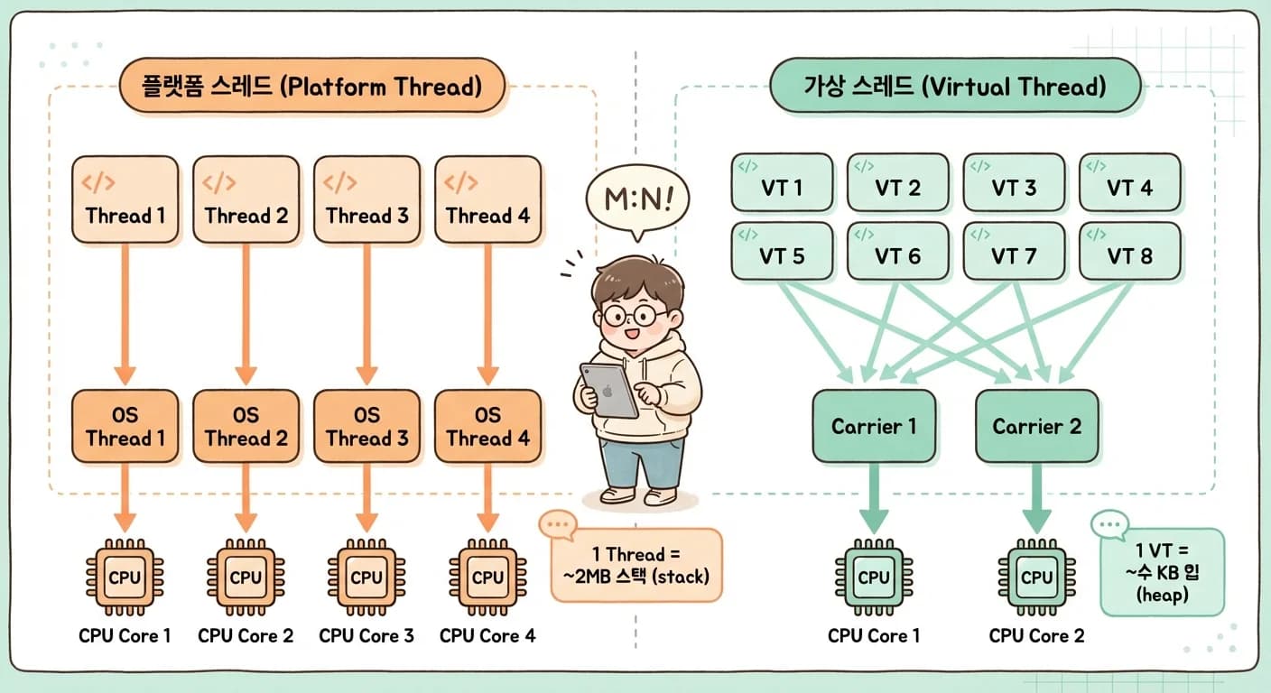 자바 개발자라면 를 수도 없이 써봤을 겁니다. 스레드 풀을 만들고, 에 작업을 던지고, 로 결과를 받는 패턴은 눈 감고도 칠 수 있을 정도입니다. 그런데 어느 날 동료가 "가상 스레드 써봤어?"라고 물어왔을 때, 솔직히 말하면 제대로 대답하기 어려웠습니다. Java 21에서 정식으로 들어왔다는 건 ...