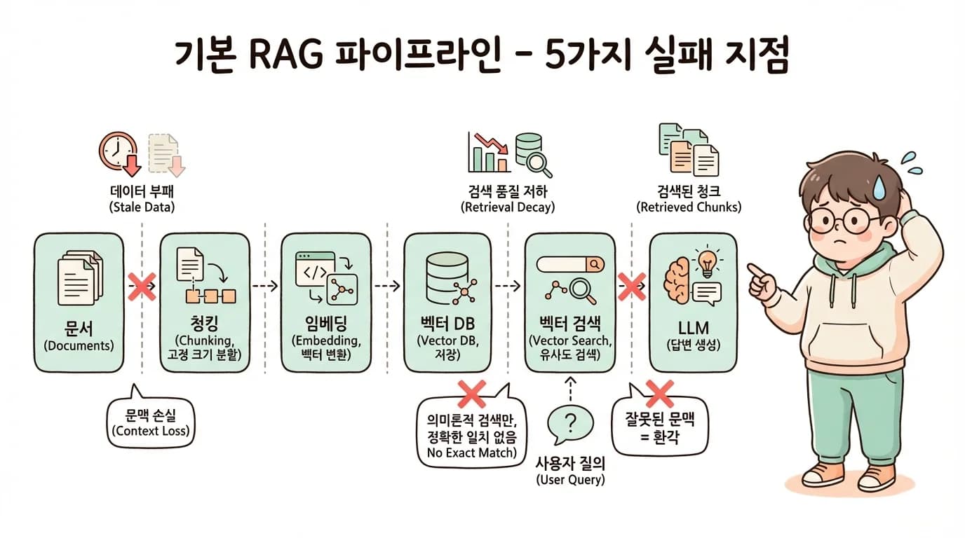 "벡터DB에 문서를 잘라서 넣고, 사용자 질문으로 유사한 청크를 검색하고, 그걸 프롬프트에 붙여서 LLM에 보냅니다. 이렇게 만들었는데 왜 결과가 형편없는 겁니까?" 최근 개발자 커뮤니티에서 이런 질문이 부쩍 늘었습니다. 질문한 사람의 상황은 대부분 비슷합니다. O...
